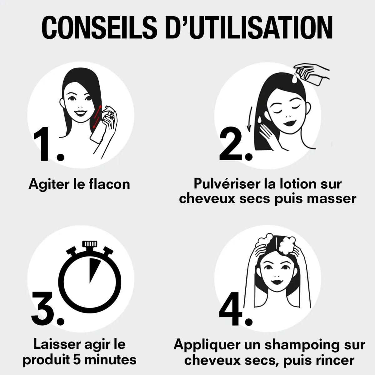Bien agiter le flacon avant utilisation, couvrir les épaules pour éviter de tacher les vêtements. Pulvériser la lotion sur le cuir chevelu et les cheveux secs, des racines jusqu’aux pointes, en veillant bien à ne pas oublier les oreilles, la nuque et les tempes.