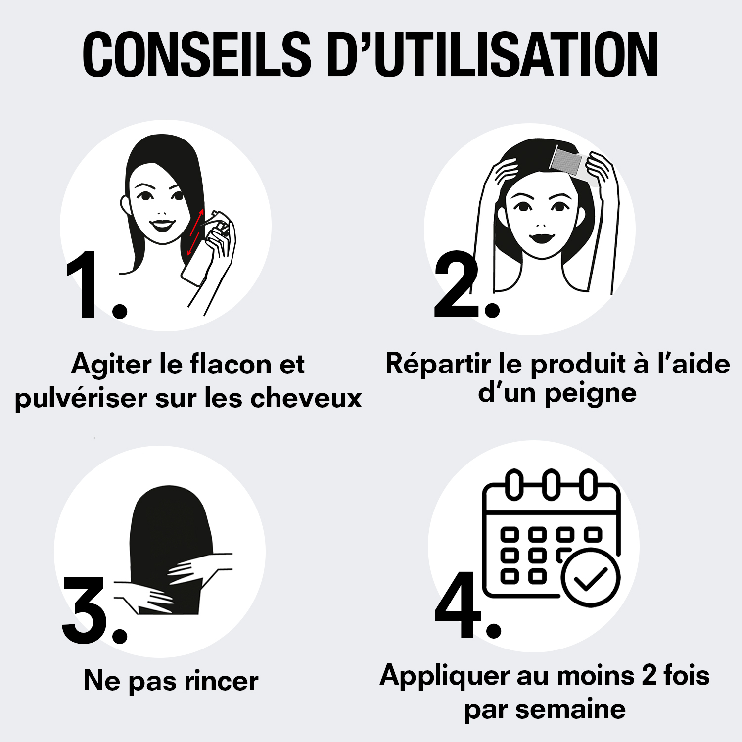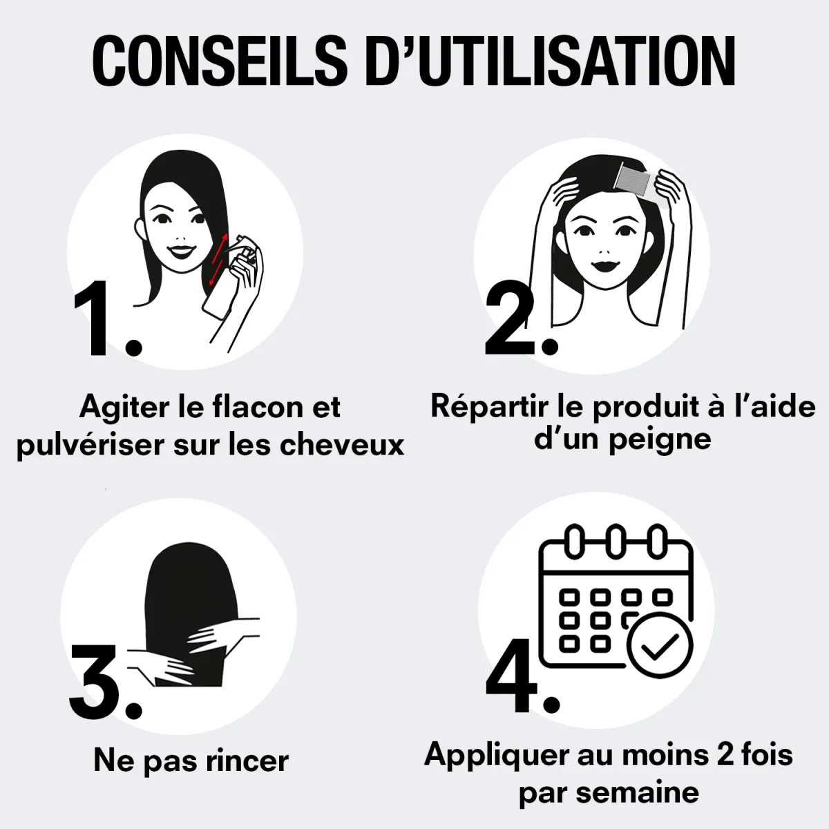 Sur cheveux secs : pulvériser sur toute la chevelure et répartir à l'aide d'un peigne.